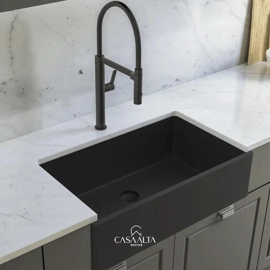 - Design Farm Sink com avental frontal aparente, projetado para ficar em evidência na cozinha;